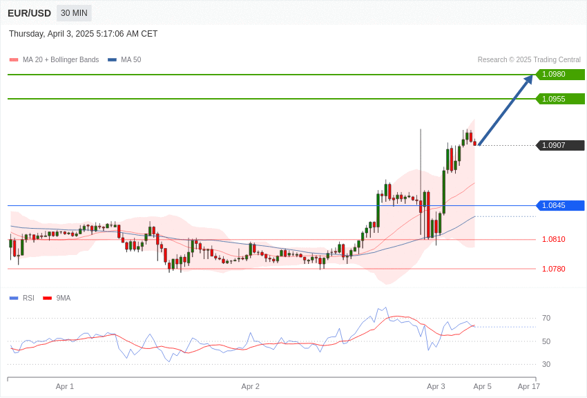 在中国,周四的经济数据显示,3月份服务业部门扩张强于预期,财新服务业PMI超过预期,达到51.9。尽管服务业数据表现积极,显示出增长,但作为出口导向型经济体的中国,预计将受到美国新关税的重大负面影响。这一预期导致周四其股市呈下行趋势,上海证券交易所指数下跌0.27%,深圳证券交易所指数下跌1.4%。同样,香港50指数在周四早盘交易中大幅下跌,截至格林尼治标准时间周四上午8:15,在iFOREX平台上显示下跌1.23%。